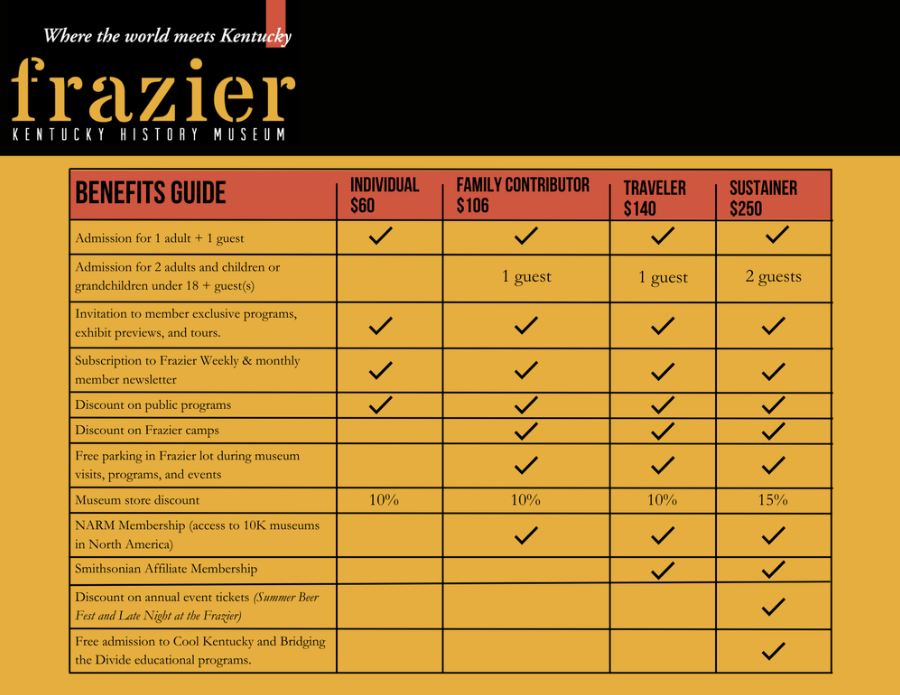 Fill out the form below to become a member. You will receive an email after your payment is processed with your receipt and a list of your benefits. If you have any questions or concerns, please reach out to Gwendolyn Gray at ggray@fraziermuseum.org or (502) 753-1031.
