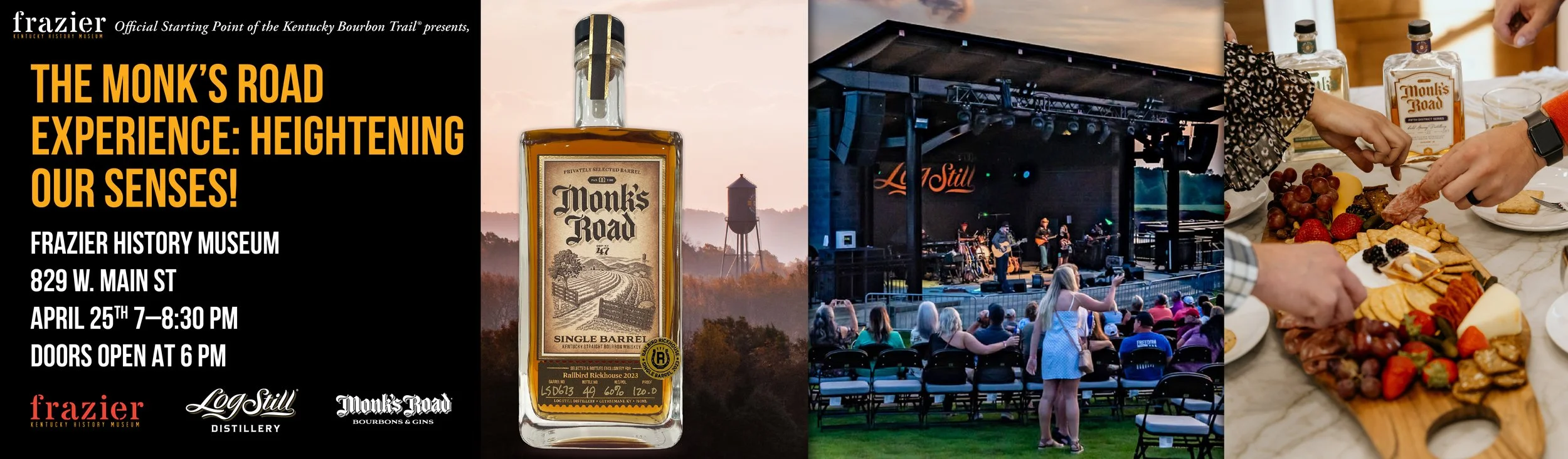Join us at the Frazier for a unique, sensory experience with Log Still Distillery; tap your toes to the live music of Kaleb Cecil, a regular in the AMP lineup; taste recipes from Monk’s Road’s new restaurant on Main, and sip on some of the spirits industry’s finest pours. From its inception, Log Still Distillery has brought faith, family, and community together along Monk’s Road in historic Gethsemane, Kentucky. Now, they are opening a high-end restaurant and tasting room, called Monk’s Road Boiler House, right down the street from the Frazier History Museum. To celebrate their arrival in the neighborhood, we’re hosting a party, a Bourbon tasting, and a barrel selection showcasing all that Log Still has to offer. Listen to live music as we discuss Amp’s 2024 concert series and savor great food and outstanding Monk’s Road spirits, culminating with our Frazier barrel selection.
