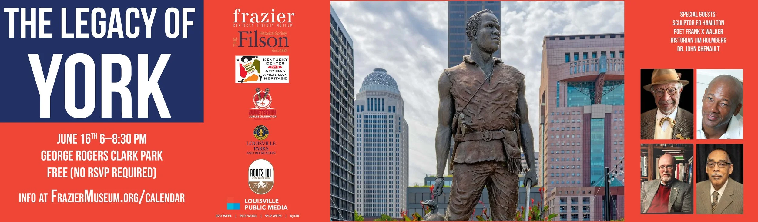 Join us on June 16 to commemorate York, a key member of the Lewis and Clark expedition, and the enslaved Black servant to William Clark. A good portion of his life was spent at Mulberry Hill, the childhood home of Clark, now known as George Rogers Clark Park. We will gather at the Lodge of the park as part of the city’s Juneteenth celebration to pay tribute to this American explorer. There will be tours, talks, singing, and poetry readings with special guests; sculptor Ed Hamilton, poet Frank X Walker, Juneteenth Commission member Dr. John Chenault, the Filson’s Jim Holmberg, Sankofa singers, and more. This free program is offered in partnership between the Frazier Kentucky History Museum, Filson Historical Society, Kentucky Center for African American Heritage, Roots101, and Louisville Parks and Recreation.