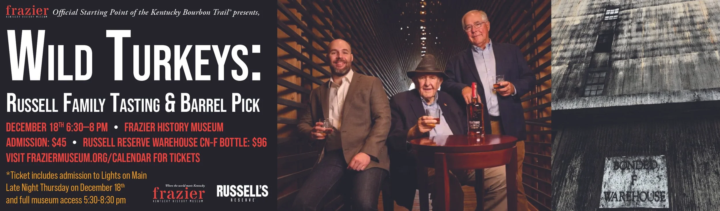 Join us for an unforgettable night at the Frazier, where three generations of Bourbon mastery come together for a once-in-a-lifetime tasting and storytelling experience. This immersive event blends the artistry of bourbon making with the soul of family tradition, culminating in a private barrel selection from the world-famous Camp Nelson F Rickhouse—home to some of the most sought-after Wild Turkey barrels ever produced.