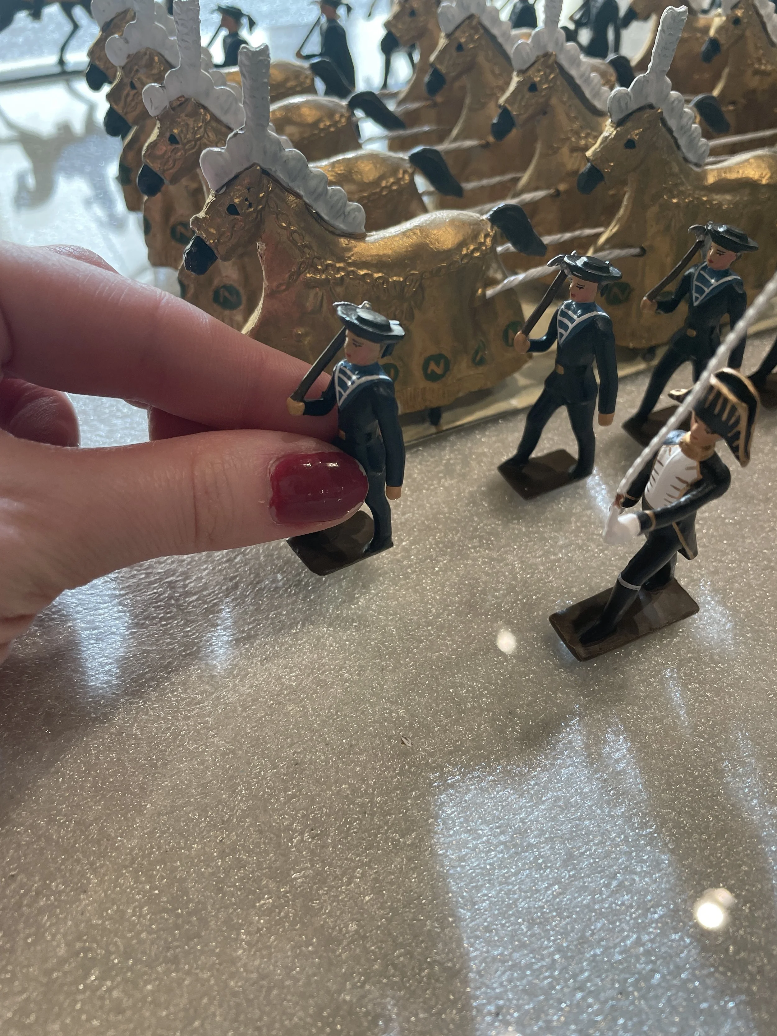 To give you an idea of what this was like, here are pictures of me placing a French sailor marching in the scene of Napoleon’s funeral procession. If you’re wondering why I’m not wearing gloves, it’s because we need the heat and friction of human skin to activate the little balls of wax we attach to the bottom of each figurine. Often, we would use a bamboo stick (pictured below, right) to help press the base of individual soldiers into place.