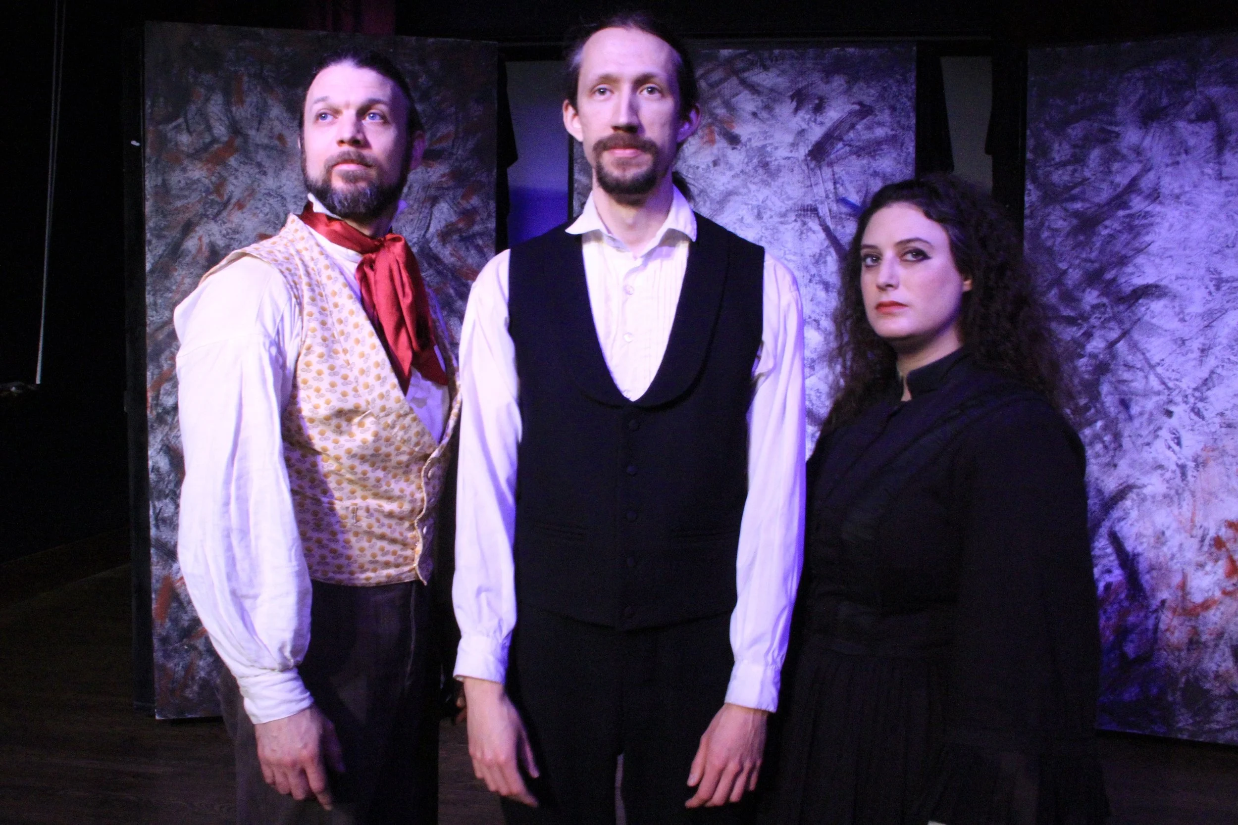 From left, actors Tony Dingman, Eric Frantz, and Kelly Moore pose for a promotion shoot for An Evening With Poe at the Frazier History Museum, October 2017. Credit: Frazier History Museum.