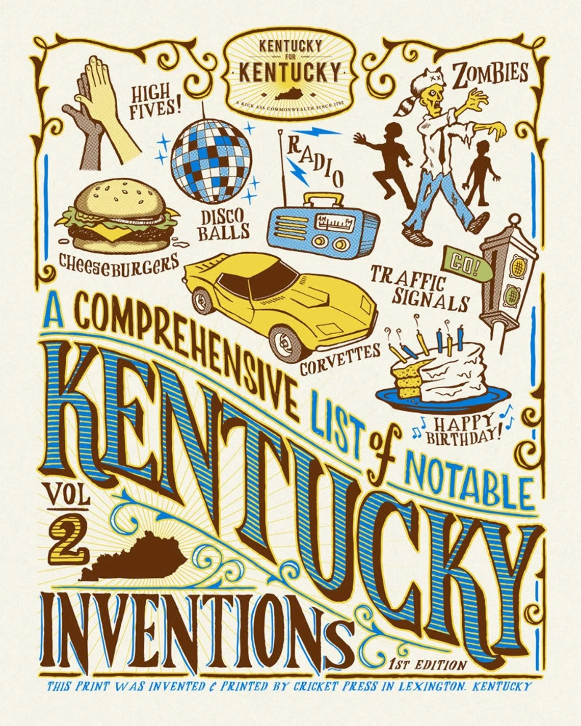 Lexington-based Cricket Press has several Kentucky-themed prints available for purchase, but my favorites are the three volumes of notable Kentucky inventions. Many of the inventions featured in the posters can be found not only in the “Inventive Kentucky” section of Cool Kentucky, but throughout the entire exhibition. Volume one features items that you can find in Cool Kentucky such as the tommy gun, the bowie knife, and baseball bats, while volume three features bluegrass music, the hot brown, and basketball rivalries. Almost everything featured in volume three can be found in Cool Kentucky: high fives, radio, disco balls, cheeseburgers, Corvettes, traffic signals, and “Happy Birthday to You.” I don’t know how they managed to fit so many COOL things onto these posters, but if you know a fan of Cool Kentucky, I’m sure they would be happy to receive a print!