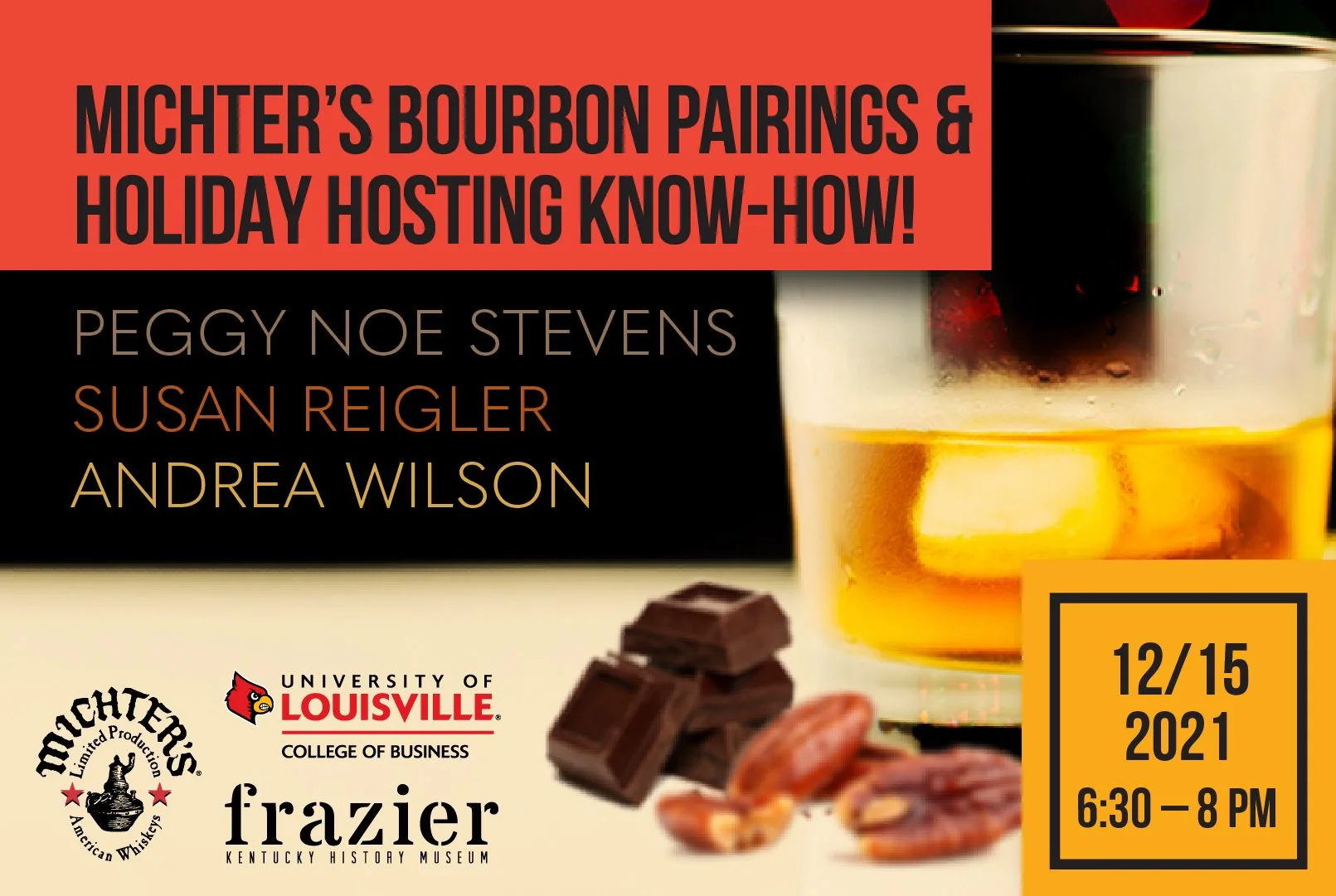 On December 15, the authors of Which Fork Do I Use With My Bourbon?, Peggy Noe Stephens and Susan Reigler, along with Michter’s Master of Maturation Andrea Wilson, will be here at the Frazier Museum to host the program. It’s a hall of fame lineup leading guests through Bourbon tastings, pairings, and holiday hosting tips. Here’s what guests can look forward to.
