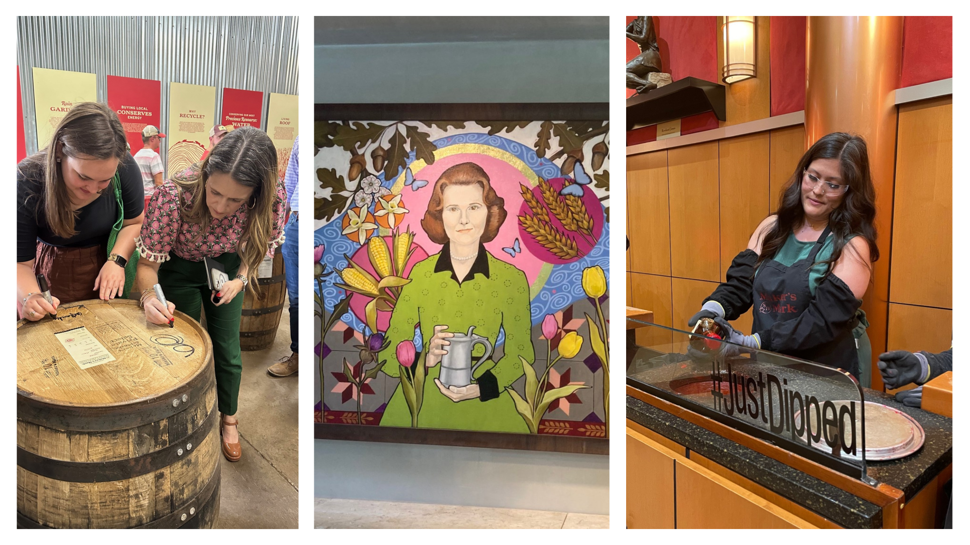 From left, Abby Flanders and Casey Harden sign the barrel during the Frazier’s Maker’s Mark Barrel Pick outing; portrait of Margie Samuels by artist Honora Jacob; Katie Lowe dipping a Maker’s Mark bottle in red wax.