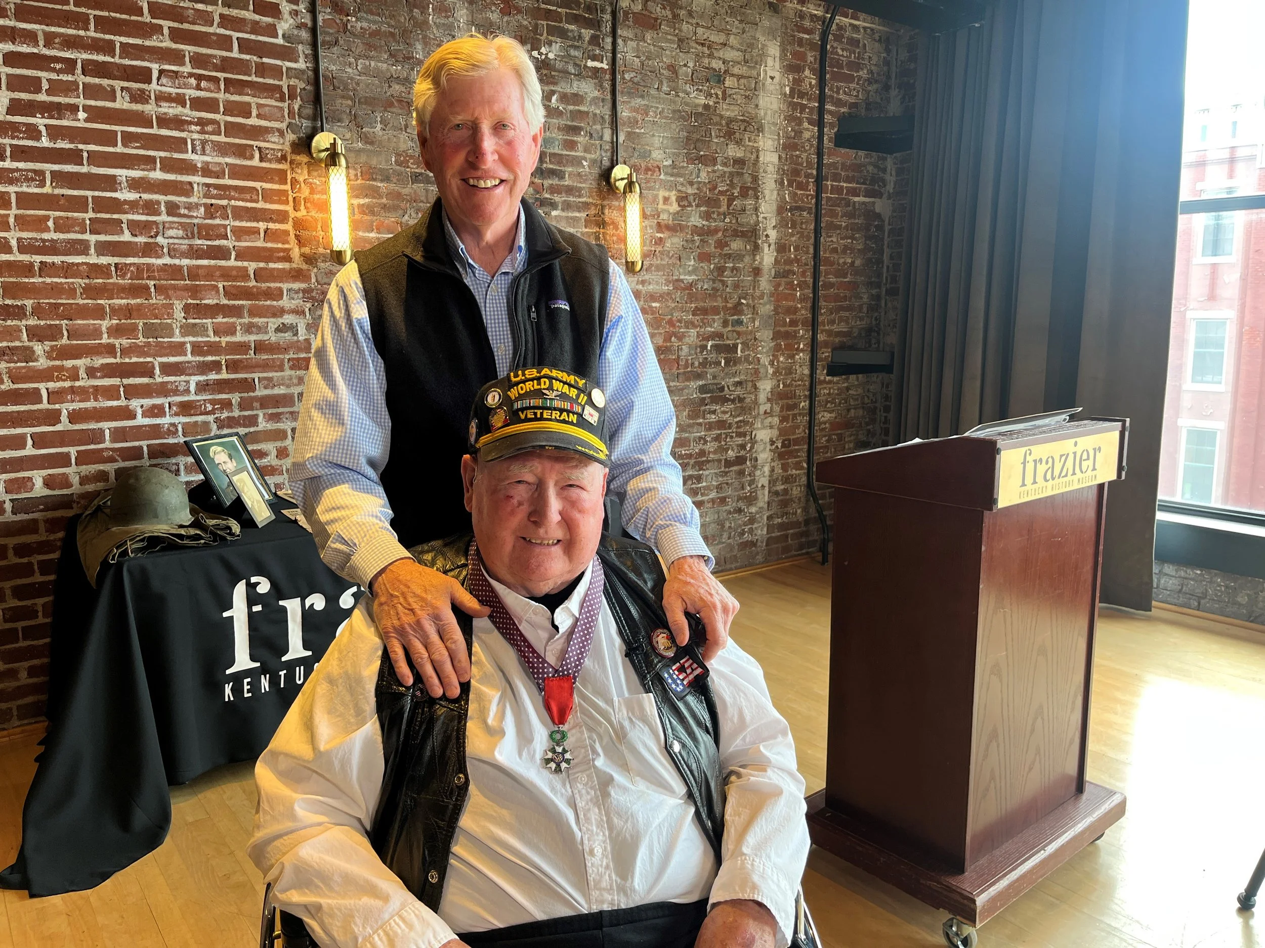 Jeff Thoke poses with World War II veteran Glenn Fisher during news conference at the Frazier, March 23, 2026.