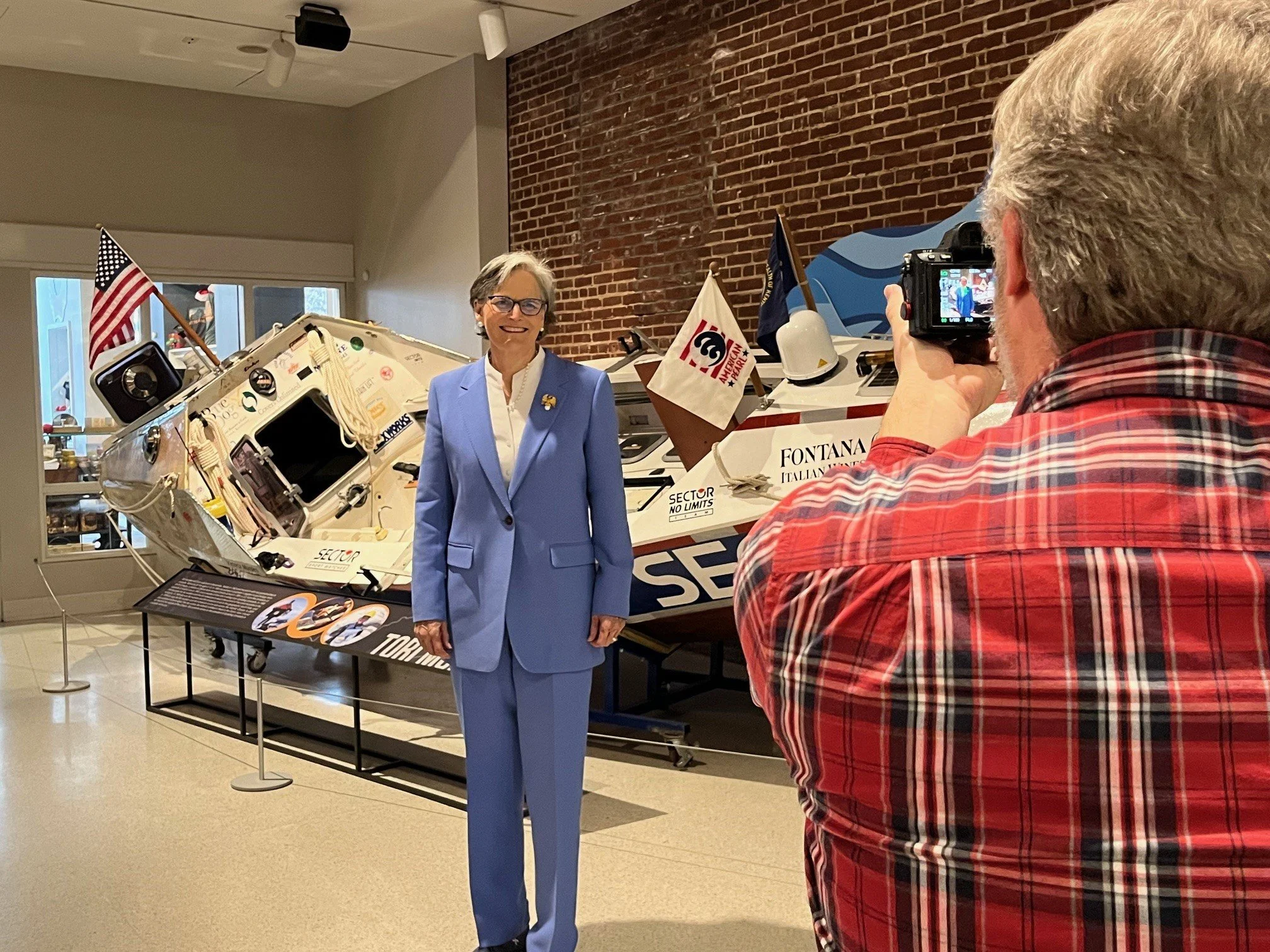 Tori Murden McClure poses with her boat American Pearl at the Frazier, December 3, 2024.