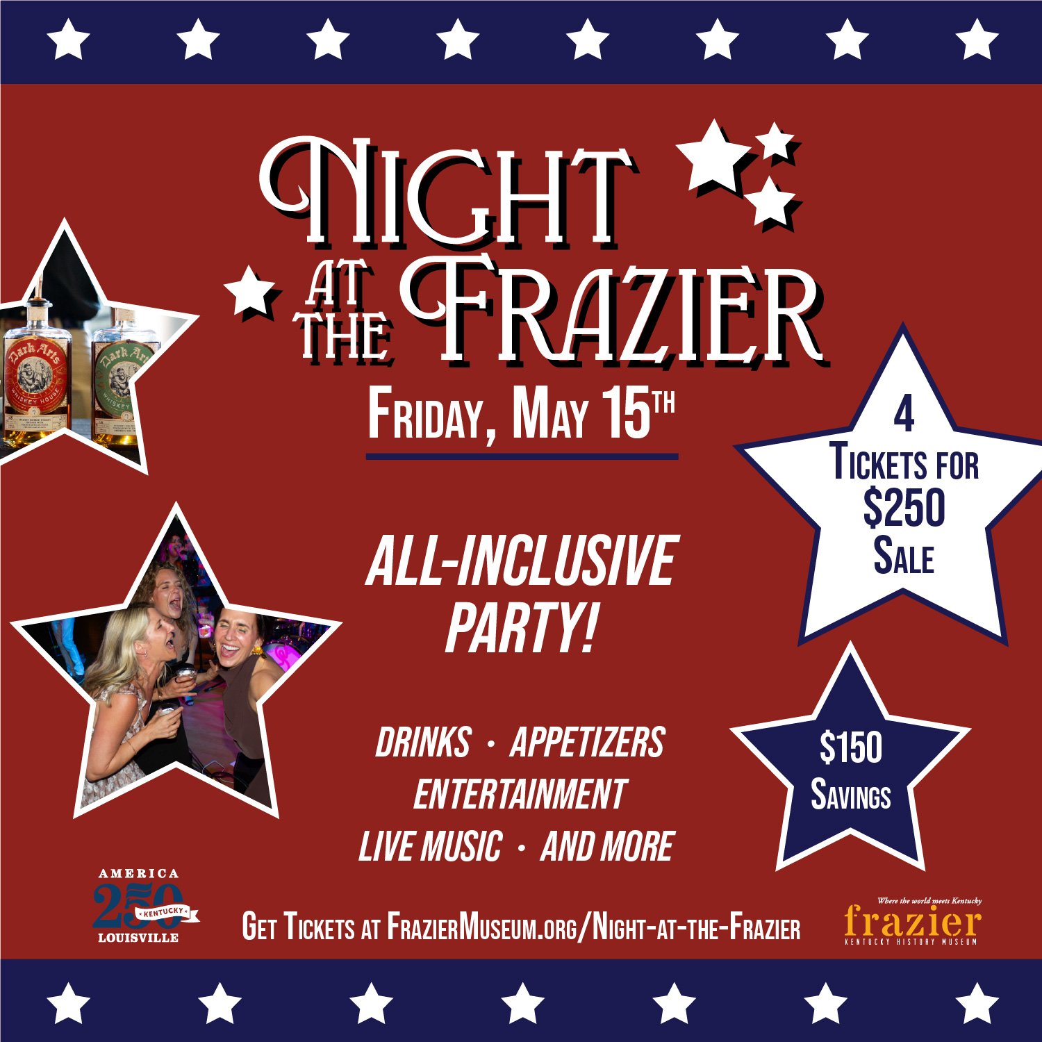 Introducing our America250 Party Pack—4 tickets for $250! It’s the perfect way to gather your friends and plan a night out you won’t forget. Whether you’re making Derby week plans or looking ahead to May 15, this is your chance to experience Louisville at its best. This limited time offer ends April 20 at midnight.