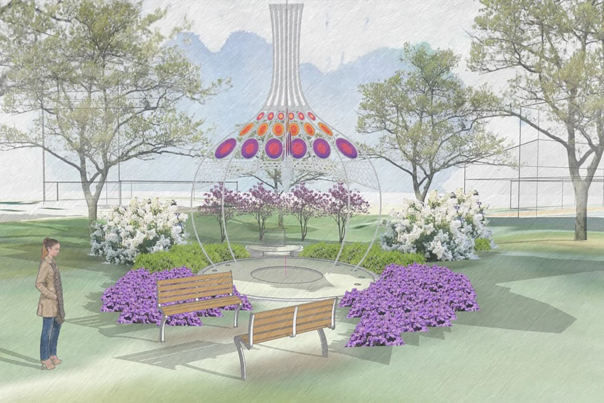 The memorial will feature an illuminated stainless steel and blown glass sculpture that stands twenty-five feet tall, benches which feature some of Powell’s glass slabs, a colorful landscaped garden, and an outdoor classroom. We will be building the sculpture this summer and dedicating it this fall.