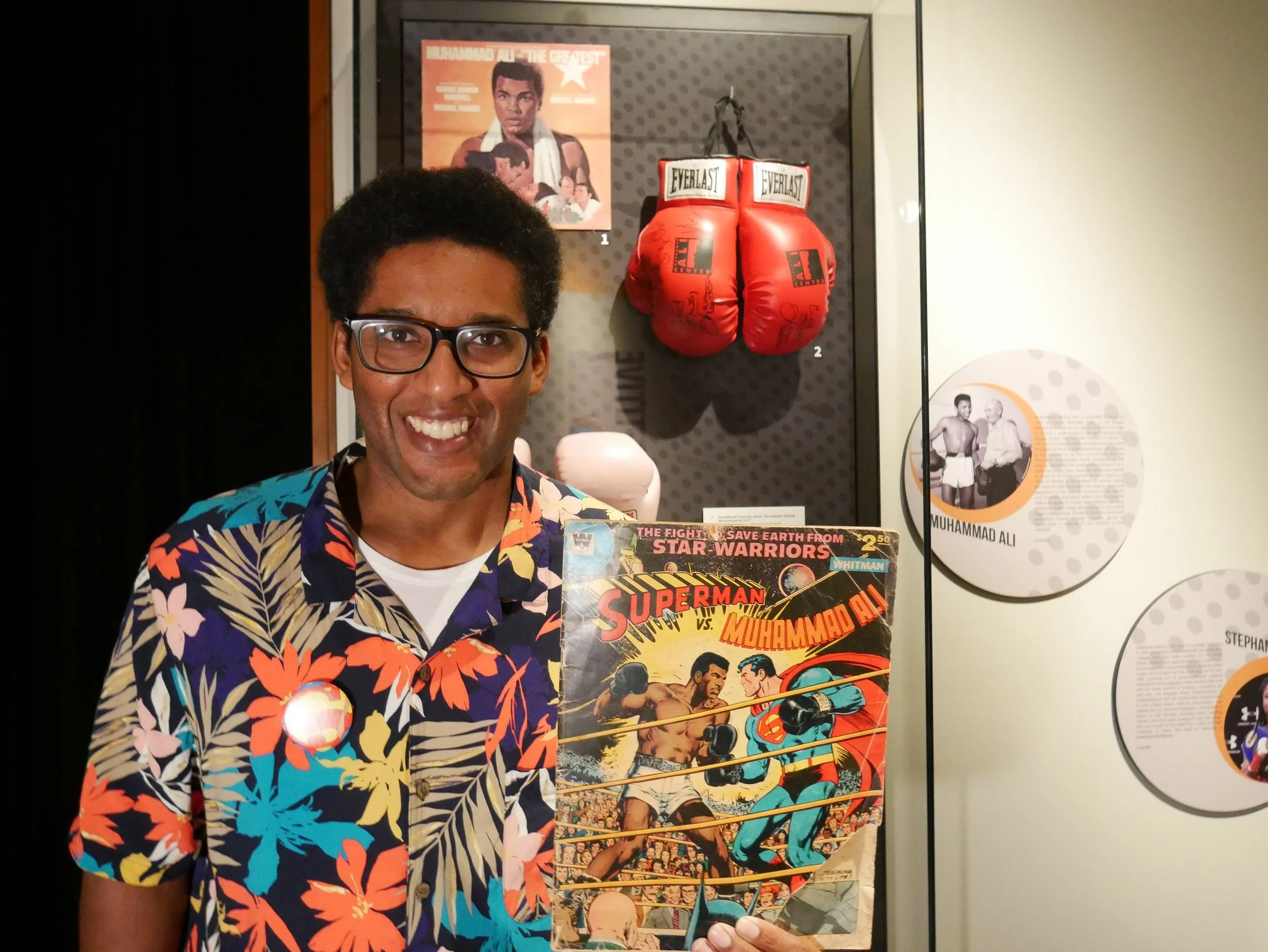 Frazier teaching artist Brian West poses with his own personal copy of Superman vs. Muhammad Ali next to artifacts on display in the Cool Kentucky exhibition at the Frazier, May 26, 2022. Credit: Mick Sullivan.