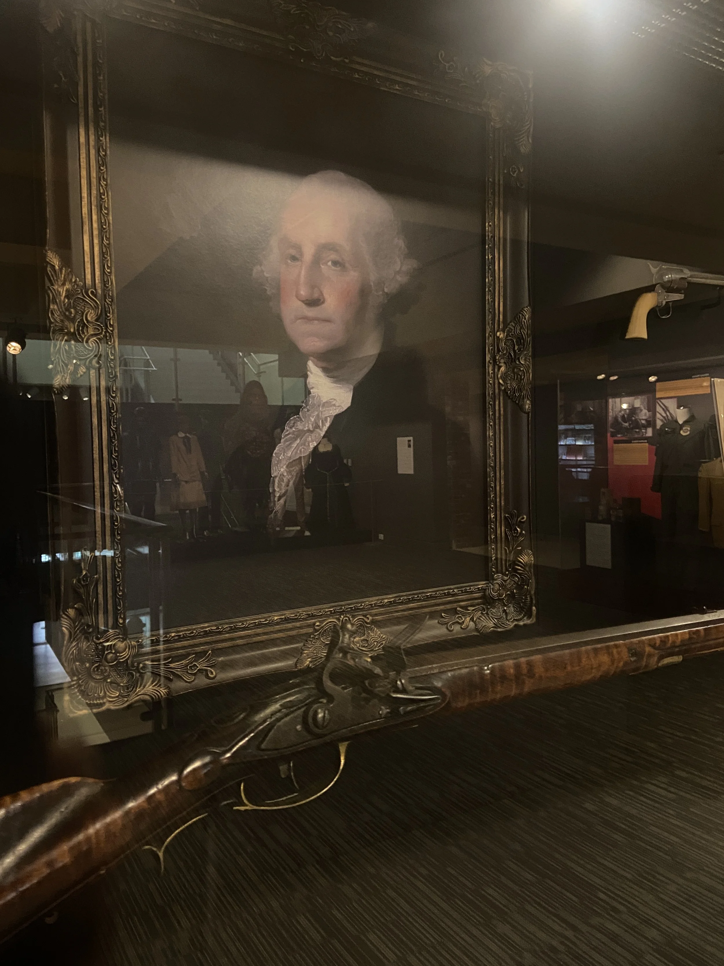George Washington’s flintlock hunting rifle and portrait on display in the Frazier’s Founder’s Gallery, June 25, 2025.