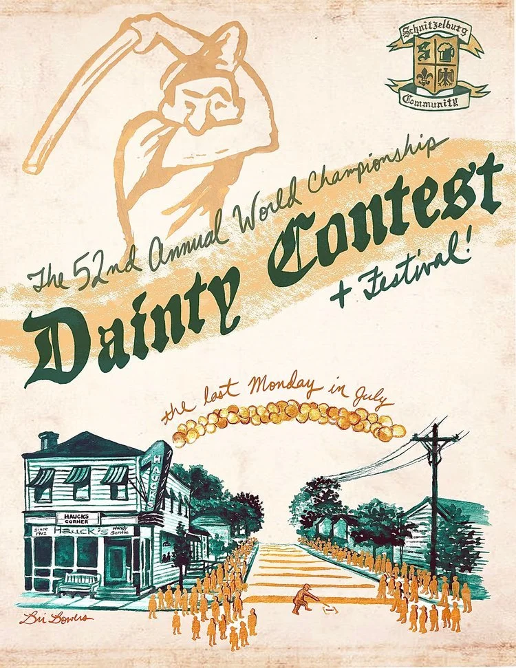 Founded in 1971 by George Hauck and his longtime friend Charlie Vettiner, the World Championship Dainty Contest is a community event that brings hundreds of area residents to the intersection of Goss Avenue and George Hauck Way on the last Monday in July.